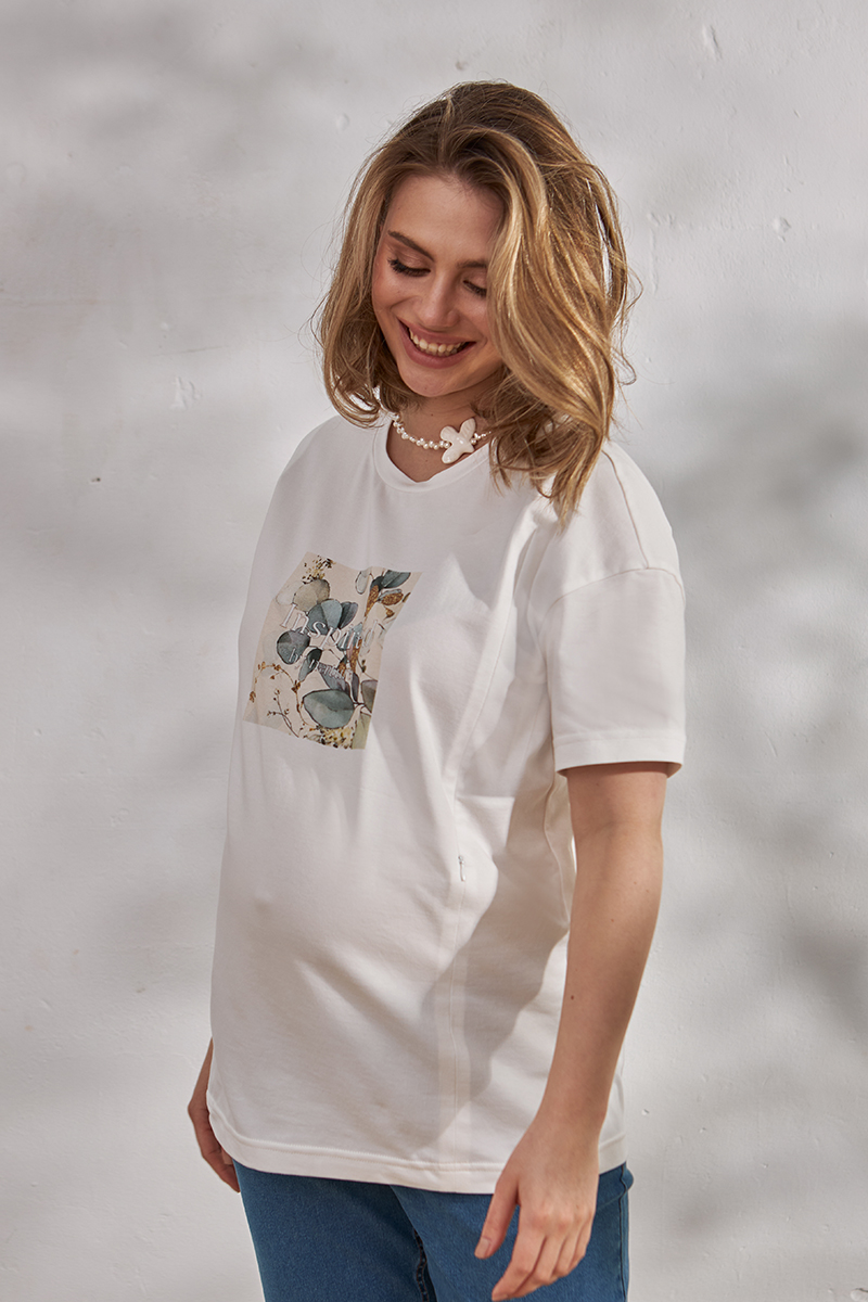Стильна футболка для вагітних та годуючих з яскравим принтом.