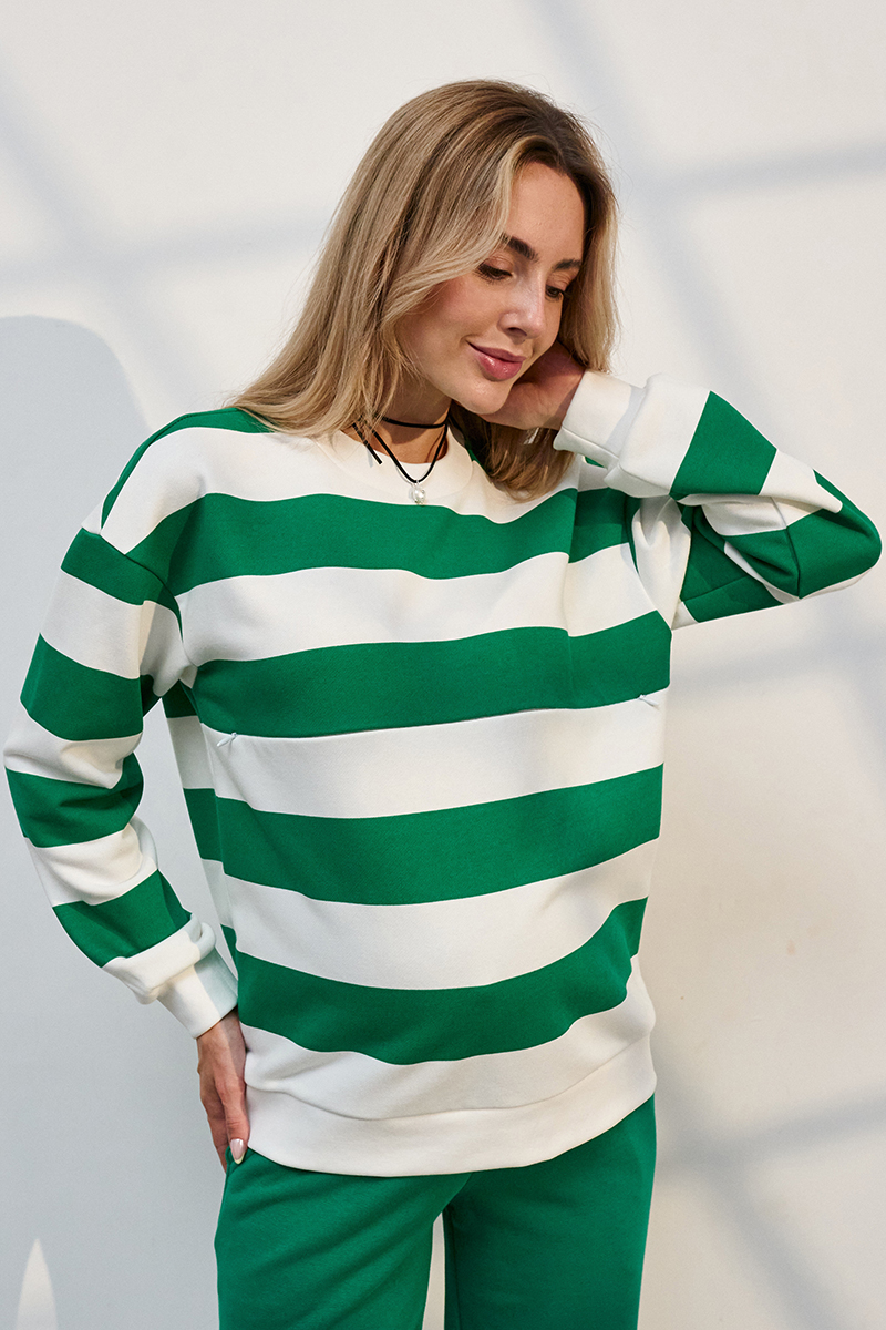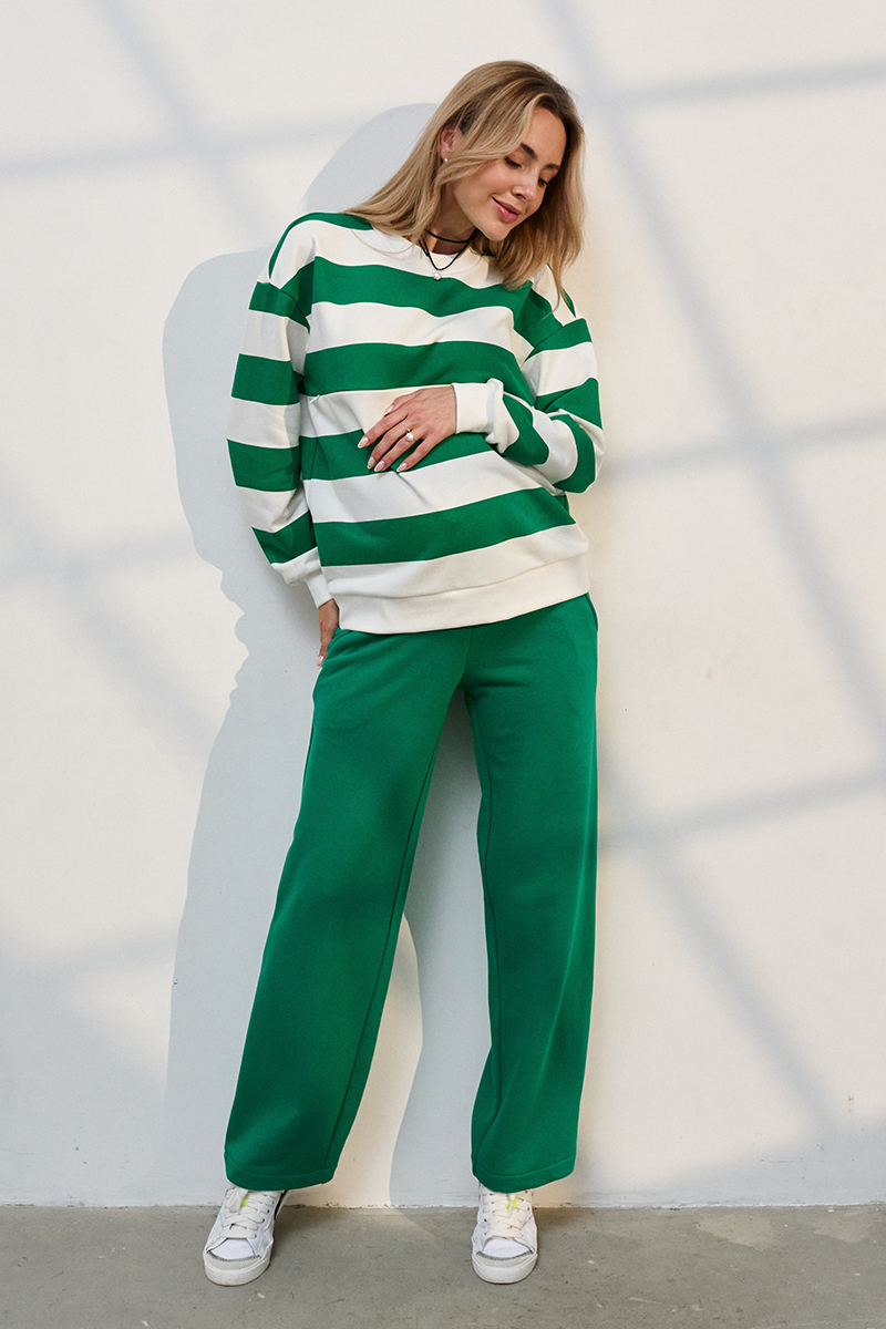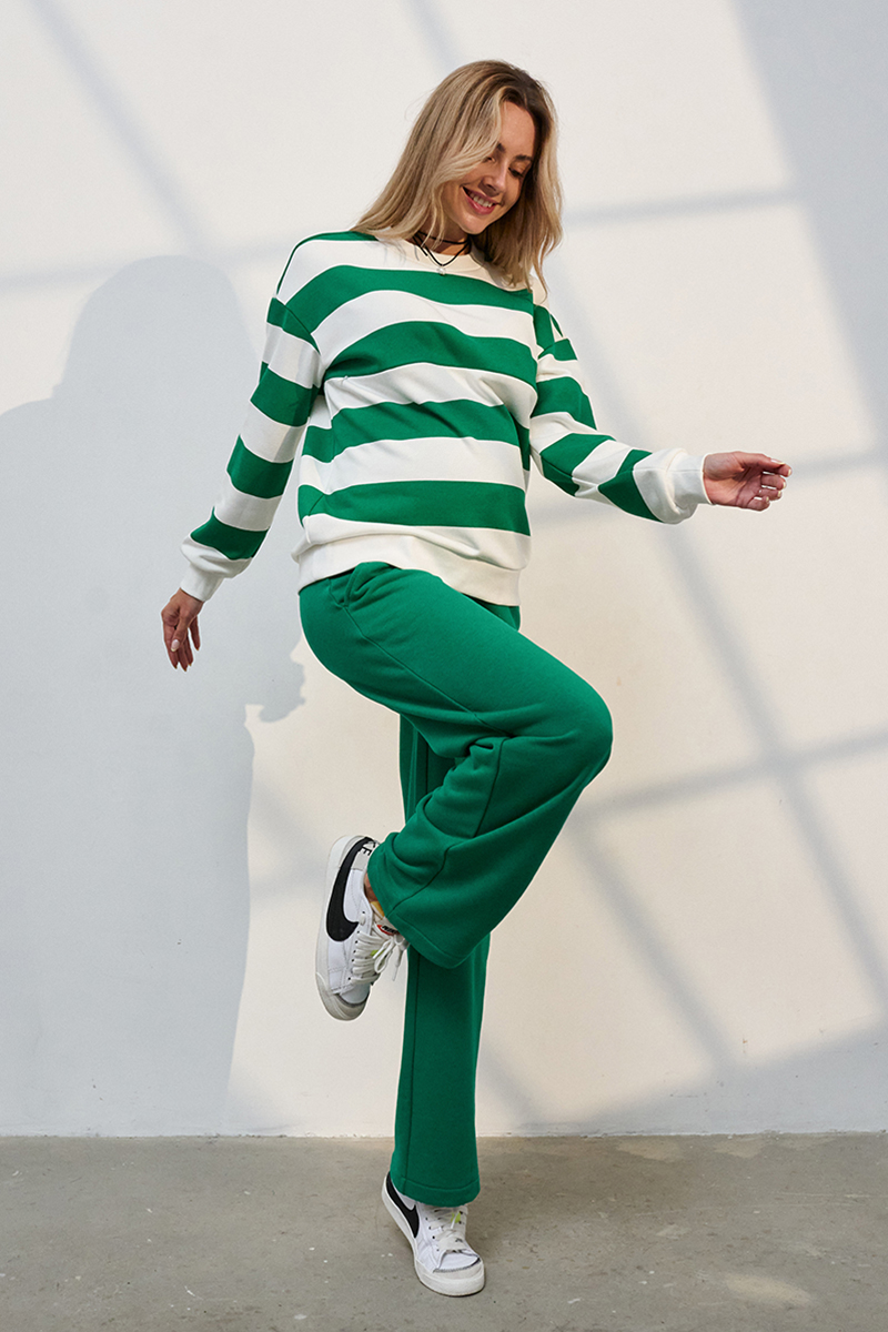 Трендовий костюм зі смугастим світшотом та прямими брюками із щільного трикотажу.