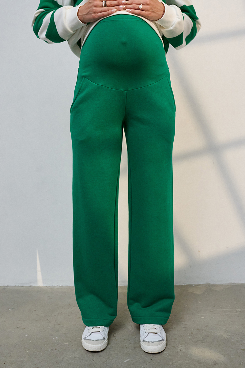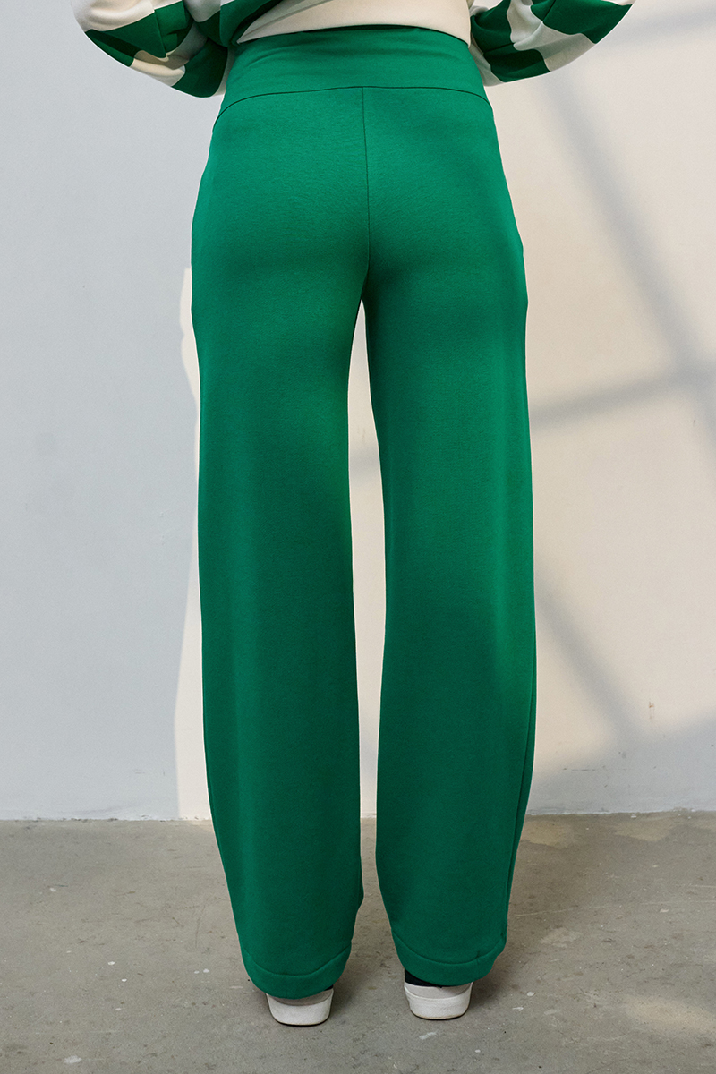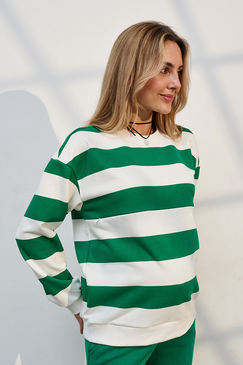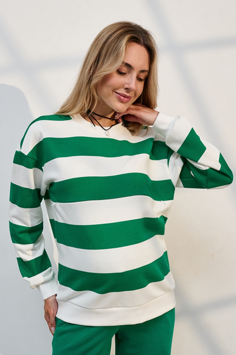 Трендовий костюм зі смугастим світшотом та прямими брюками із щільного трикотажу.