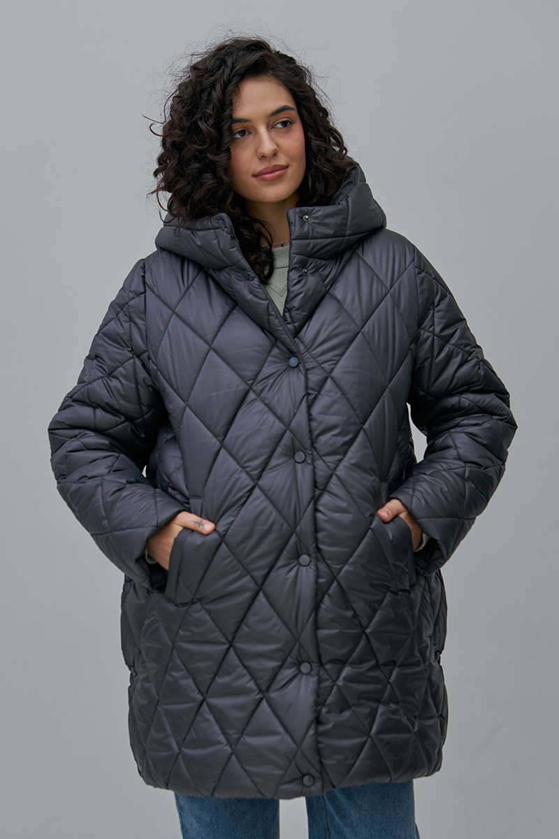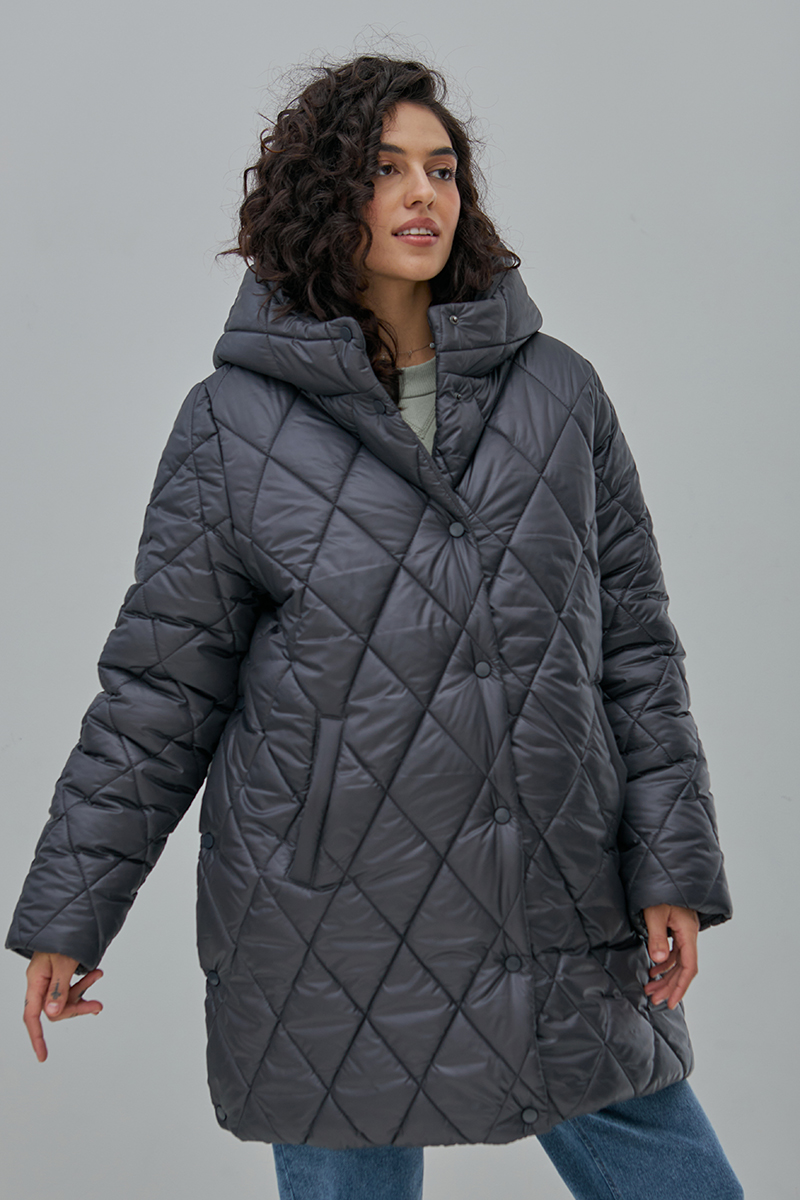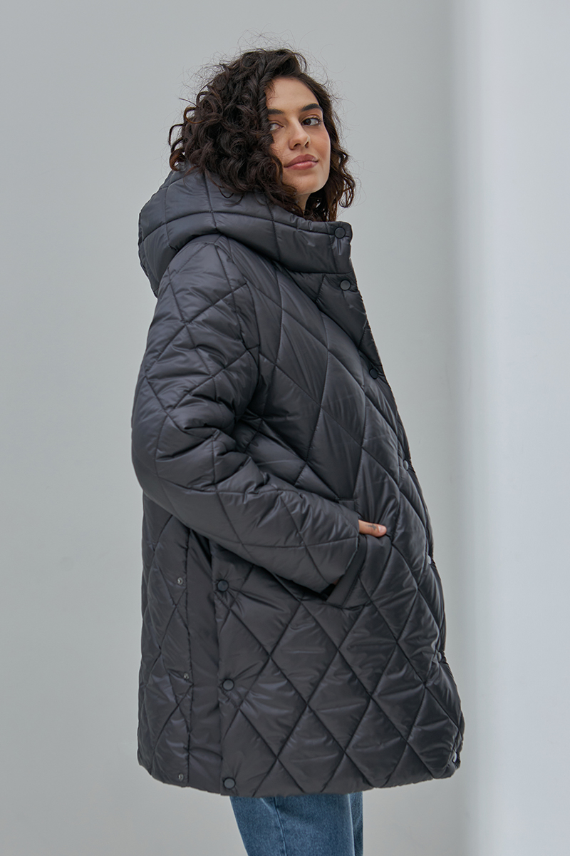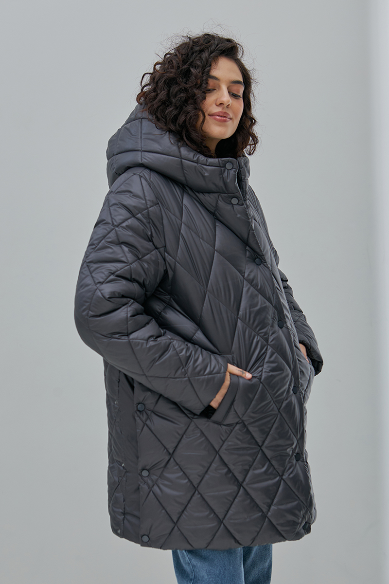 Тепла стьобана куртка для вагітних, на кнопках та із бічними розширювачами.