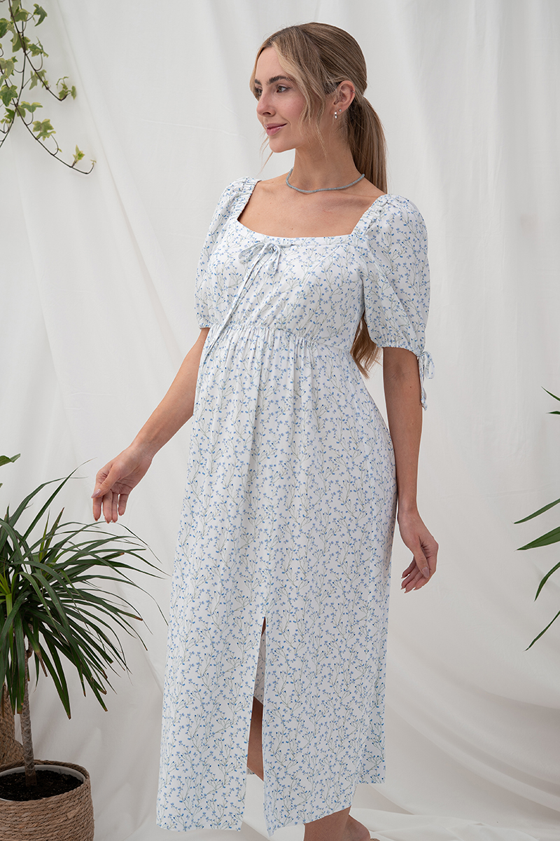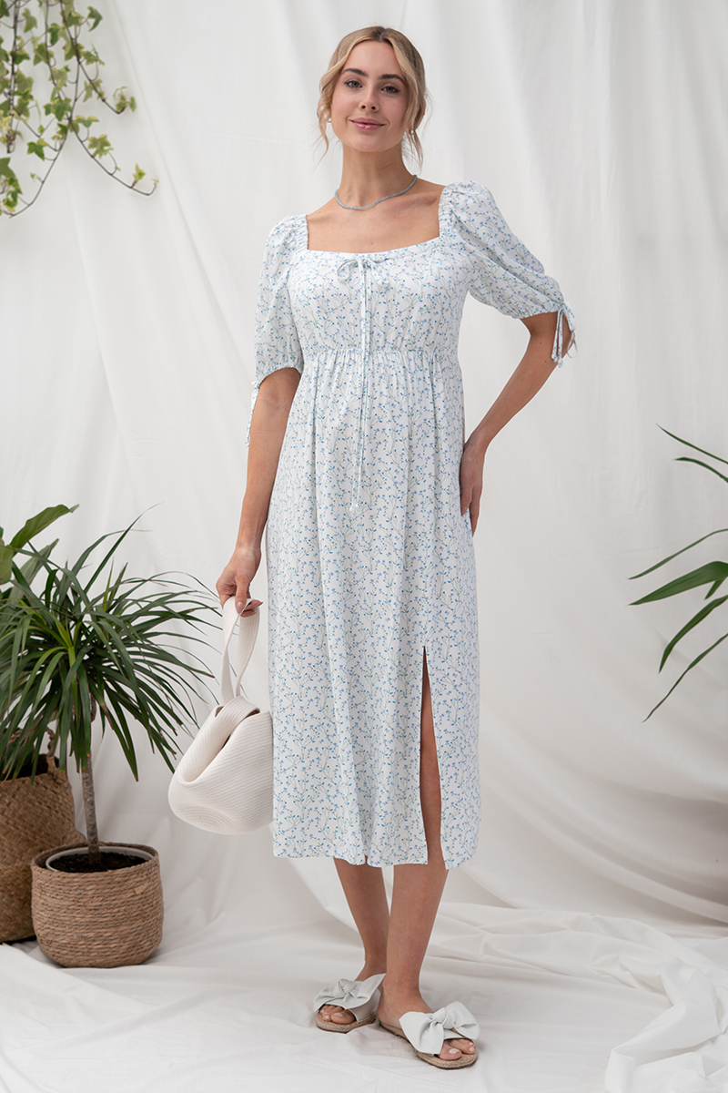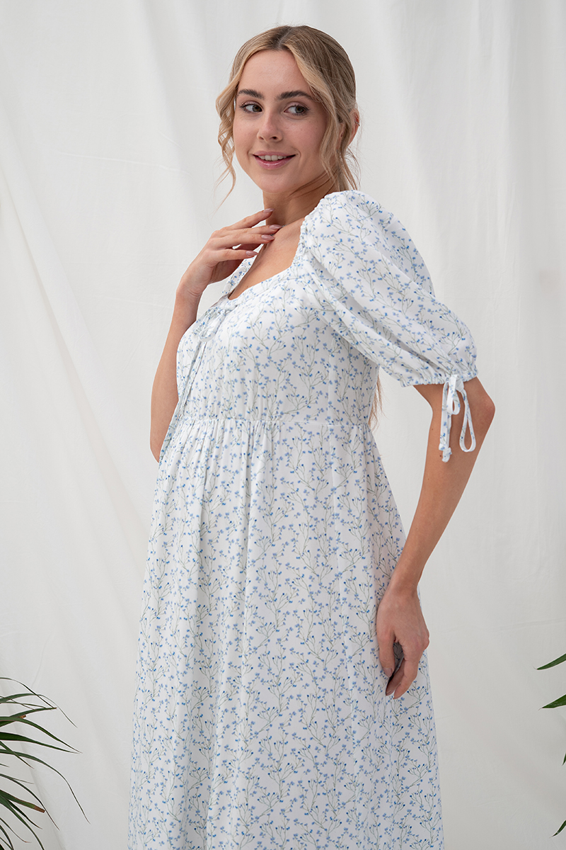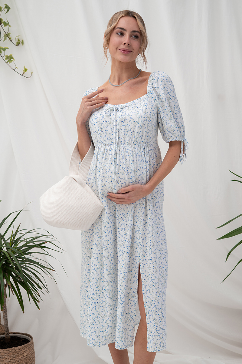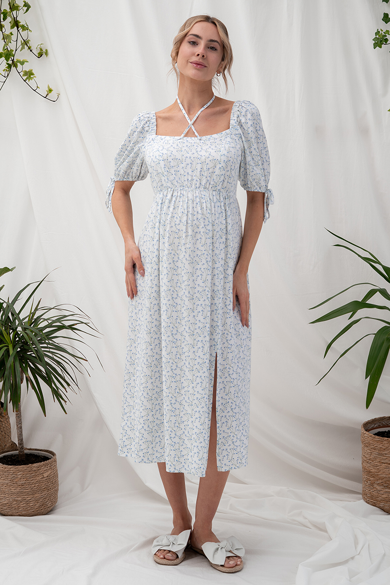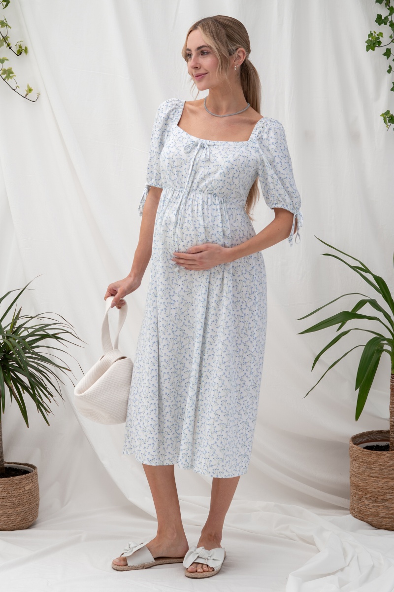 Сукня для вагітних і годуючих зі штапеля довжини міді зі зав'язкою на шиї, що трансформується.