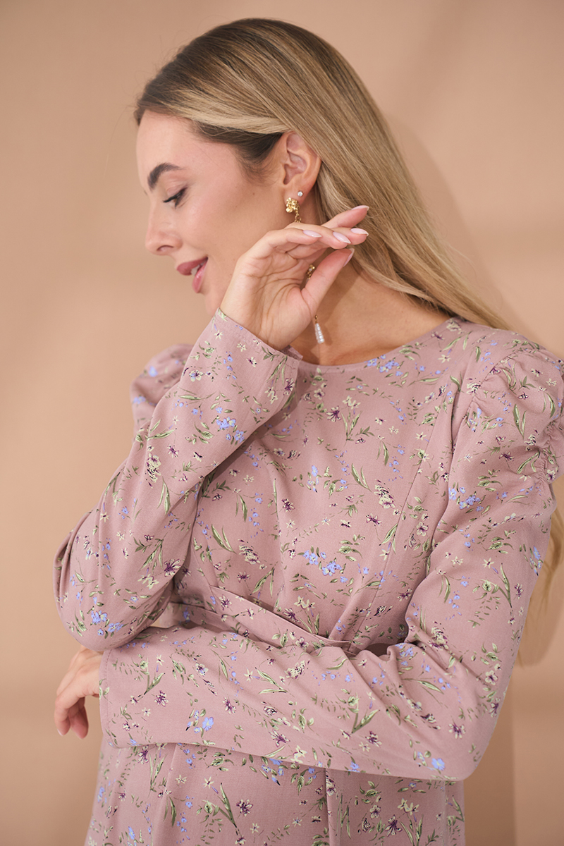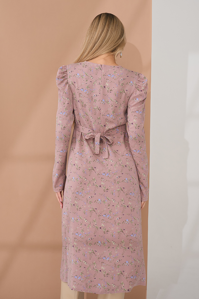 Оздоблення: рукава-буфи й ефектний розріз на спідниці, зміщений у лівий бік.