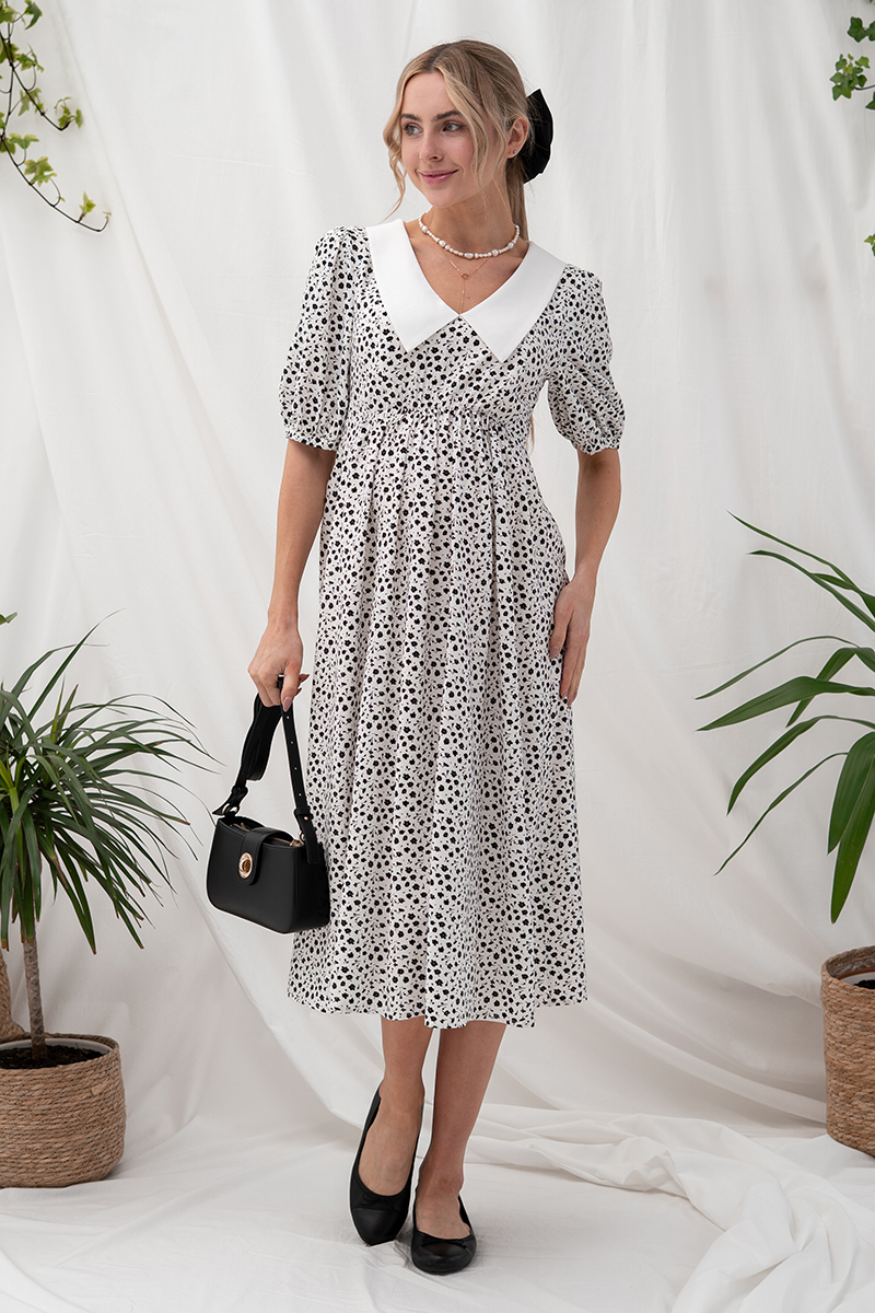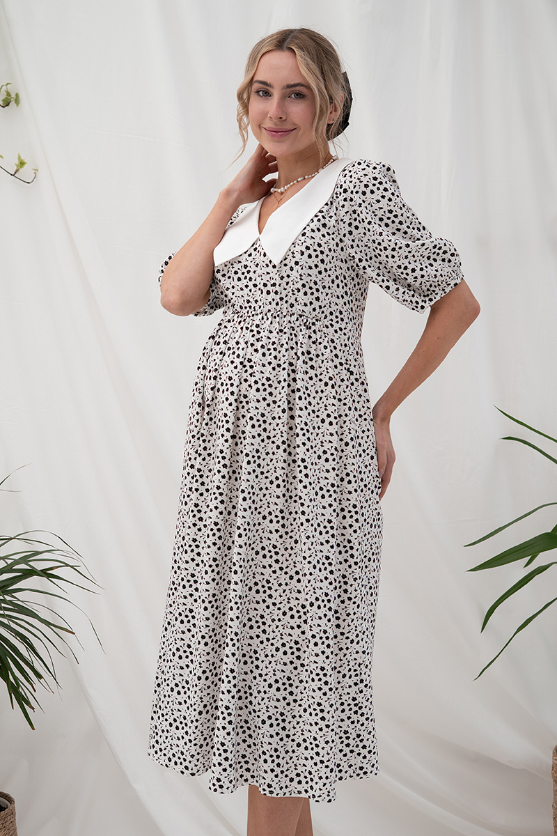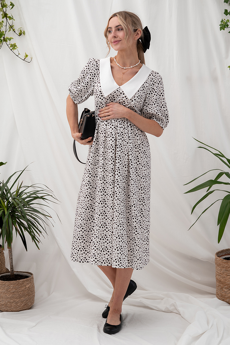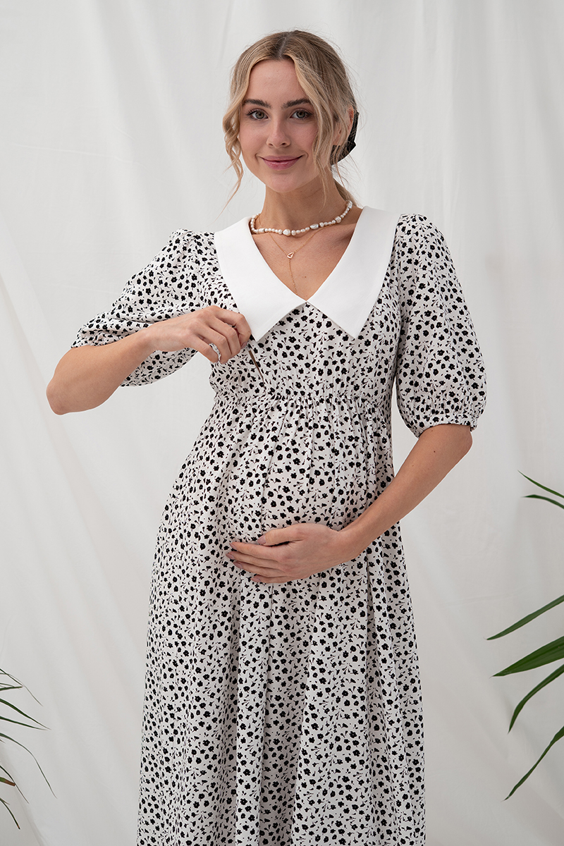 Трендова сукня для вагітних і годуючих з контрастним комірцем.