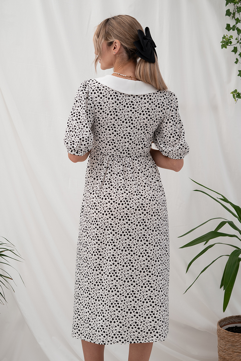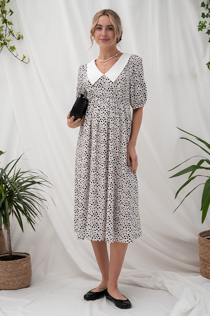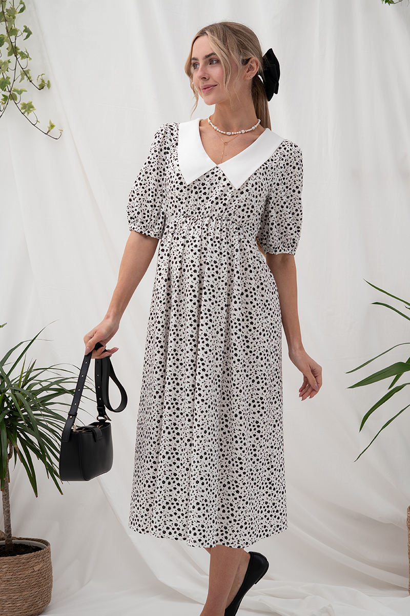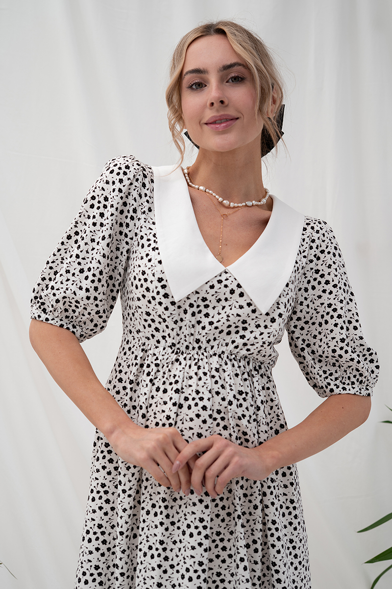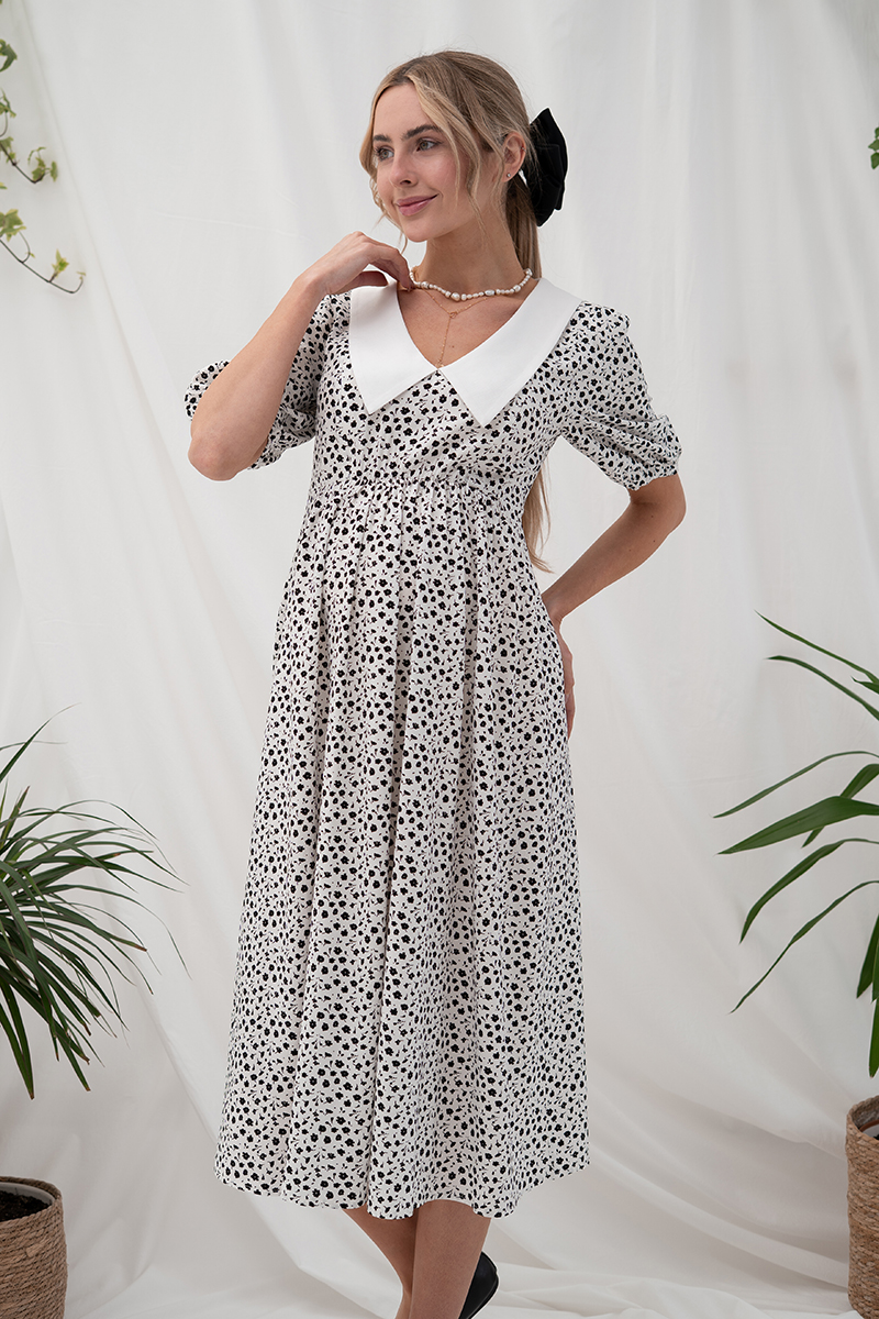 Трендова сукня для вагітних і годуючих з контрастним комірцем.